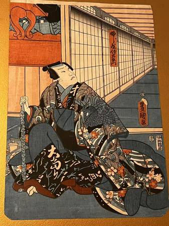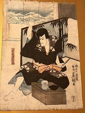 Published in mid 19th century, these two original Japanese woodblock prints depict Meiji period Kabuki actors in Edo (Tokyo) by Utagawa Kunisada. Also known as Toyokuni III, Kunisada (歌川 国貞 1786-1864) was one of the most popular and prolific ukiyo-e print designers of his time. Kunisada's work focused heavily on Kabuki and actor prints, which account for about 60% of his designs.