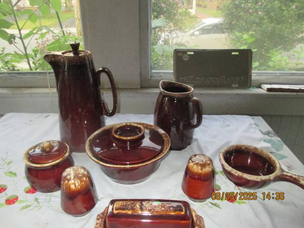 Set of vintage Hull pottery; includes Coffee pot, milk pitcher, Serving bowl with lid, soup bowl, butter dish, salt and pepper shaker, and sugar bowl. asking $40