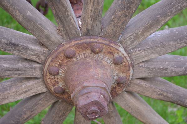 The wheel bearings turn. The wheels are intact, but spokes have been damaged by power post beetle and some should be replaced.