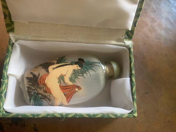 Reverse painted antique snuff or scent bottle with stopper in original box Different female form on each side