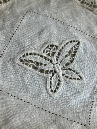 3 Piece Antique Hand-Made Crocheted Lace Doilies and Handkerchief, including: a round off-white 8" butterfly center, a seven-point round tan 9", an off-white 9 1/2" square linen handkerchief, all in...