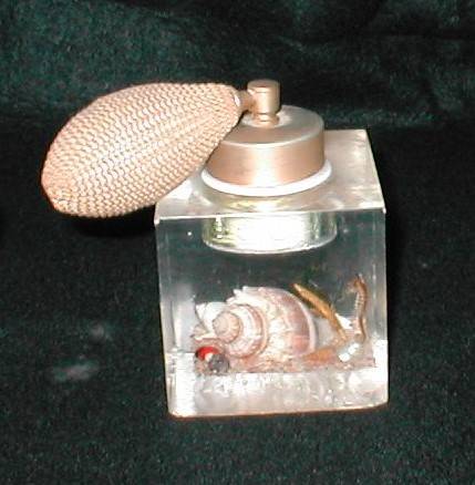 1. Perfume bottle with shells. Lucite, atomizer works. Small chips on corners. 2 1/2" $5
