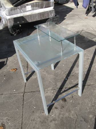 Makeup table with chrome legs has two glass tops. Measures 30" tall from the floor to the actual glass table and 36" tall to the top of the glass shelf. It is 32" wide and about 17" deep. Used as a display stand for cosmetics, but you can place a monitor on the top shelf and have plenty of room for writing and typing. The table is dusty (will clean up), Otherwise- in perfect condition.