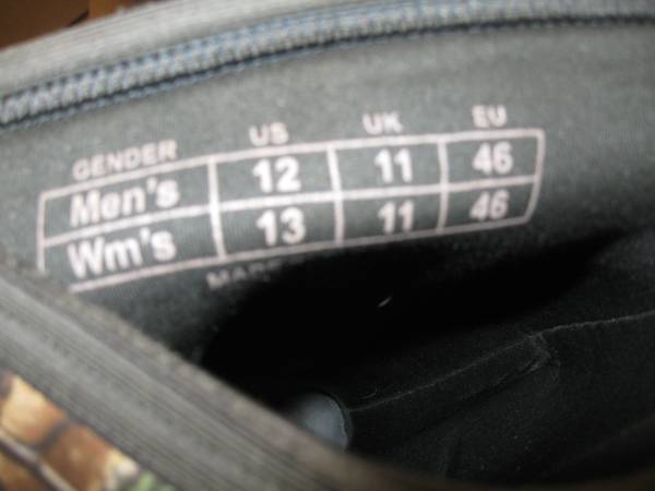 Men's size 12. Right boot has a small rip about 8" off the ground. Otherwise- very good condition.