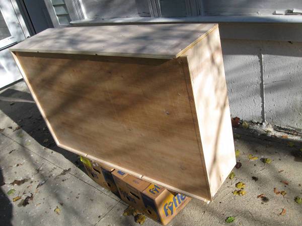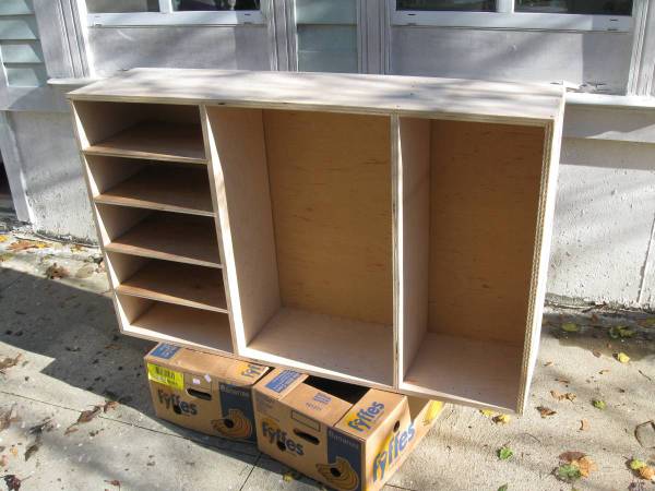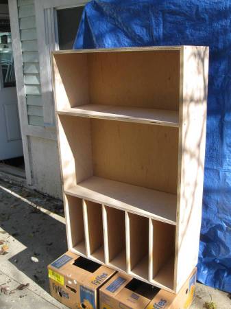 This is unfinished wooden storage unit that could be either hung on the wall or stand alone. The dimensions are 52" high, 32" wide and 13- 1/4" deep. There are predrilled holes in the middle section for possible placement of an adjustable shelf or two. Original intent to use was for wine collection hanging on the wall. The bottom section accepts about 10- 12 bottles in flat position in each partition. The shelf also could be used on its side, then the dividers in the bottom section become shelving on the side- see the pictures. The unit comes without finished backing (it is 1/2" thick and designed to be affixed to the wall). If you do need the back, then it will be $30 extra. Once again: the shelving is not finished and will need perimeter trim (if desired). Color it any color you want, apply any clear finish of your choice or leave as is. Solid construction on tight joints reinforced with glue and screws.