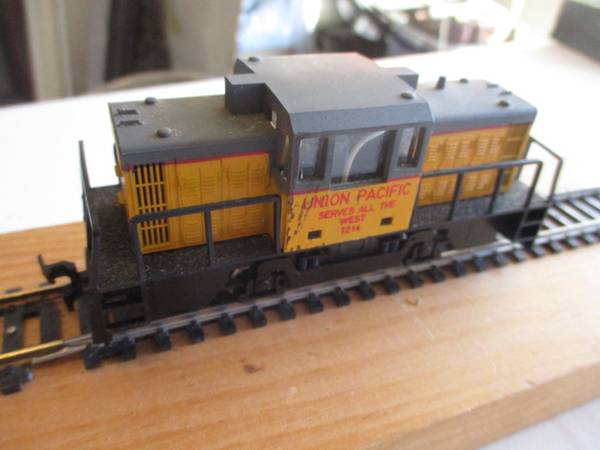 AHM UNION PACIFIC SWITCHER CAB DIESEL FOR HO GAUGE. #1214, MADE IN YUGOSLAVIA. RUNS OK AS CAN BE SEEN IN A VIDEO POSTED ON FACEBOOK. WILL RUN BETTER ONCE WHEELS ARE CLEANED. LOOKS LIKE THE HORN IS MISSING. FRONT RAIL IS SPLIT IN TWO. PHOTO INCLUDED. YOU CAN EASILY GLUE THIS. SOMETIMES THE LIGHT WORKS. DON'T COUNT ON IT.