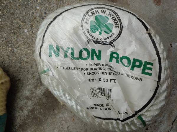 Nylon Rope 1/2" diameter x 50 feet. Super strong. Ideal for boating, camping, and general use. Shock resistant. unused new still in original packaging. Best Offer.
