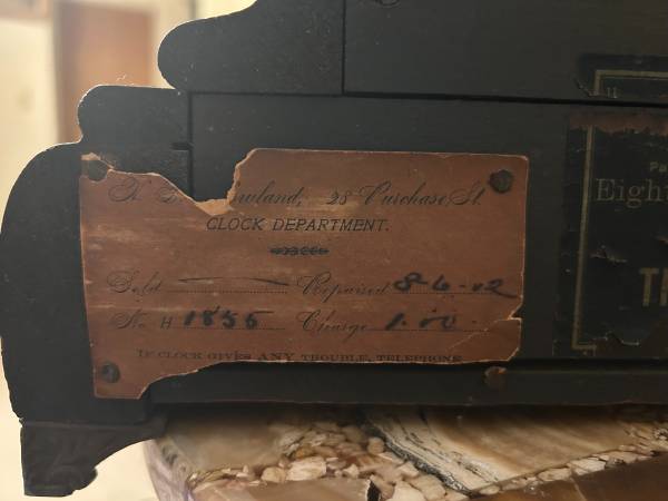 • The clock features an ebonized wood or faux-marble case with red and black veining on the columns.