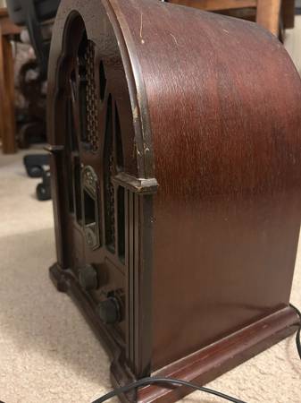 Vintage cathedral-style tabletop radio with an elegant arched wooden cabinet and original grille design.