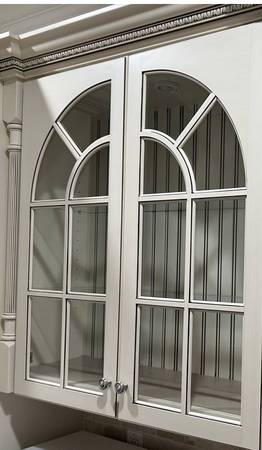 Two of the rounded glass door style cabinets and one of the rectangular glass door style cabinet are available. Already removed from kitchen and now in garage storage. Buyer must pick up.