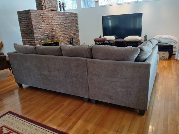 Brown 2 Piece Left Arm Facing Chaise Sectional only 4 years old, very little use Material: Fabric - Polyester 2 Accent Pillows Included 118 inches wide 84 inches deep (chaise)