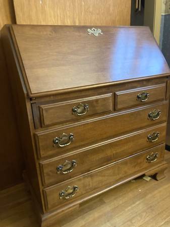 Vintage Ethan Allen secretary desk with brass pulls. 3 full size draws , 2 smaller draws. Width 34 1/2”, depth 18”, height 41” Others selling for over $1000. Very nice condition. $290 Delivery is...