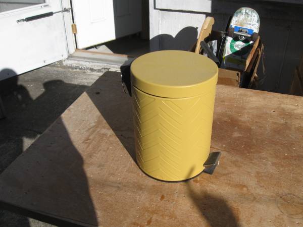 Typical trash pedal operated can but a miniature version. Can stand alone on the floor or you can hang it on the wall (loop provided). Comes with removable plastic bucket. My mother used it long time ago by her makeup table. Was sitting in the closet for a decade or so. About a foot tall and 6" in diameter. Very clean.