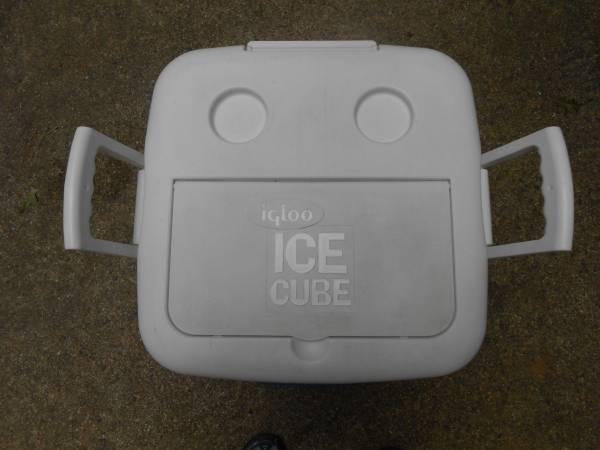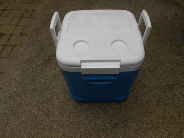 Pearl blue igloo cooler, hard-sided with ice compartment on top. Very clean, dimensions are approximately 16 x 16 x 17.