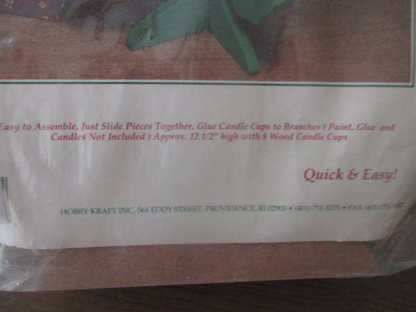 Kit includes two pre-cut tree-shaped wooden forms and wooden candle holders.