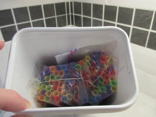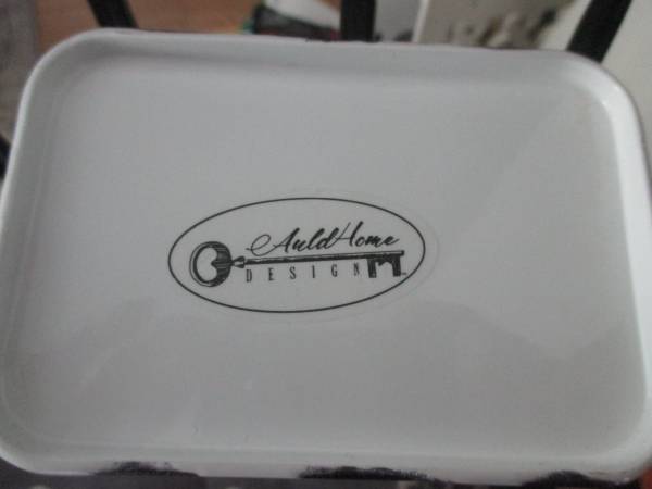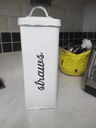 ENAMELWARE: White with black script, distressed; reads “straws”
