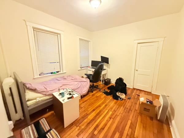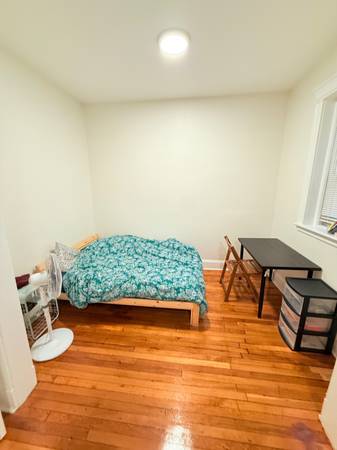 Hardwood floors, multiple windows, generous square footage — easily fits a queen bed, desk, and additional storage.