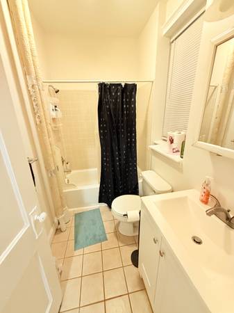 Full tub/shower, updated vanity, tiled floors, and good storage.