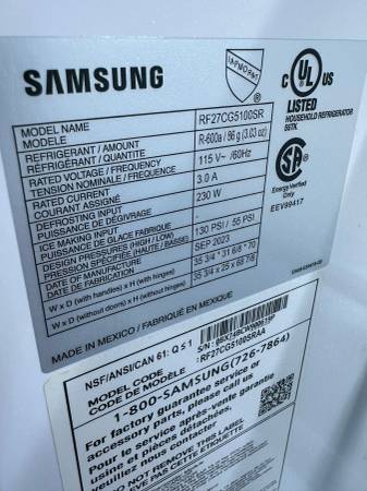 Working perfectly, fully tested. Total Capacity: 26.5 Cu. Ft. Model RF27CG5100SR Comes with a 30-day warranty. Delivery available (fee applies) or Local pickup.