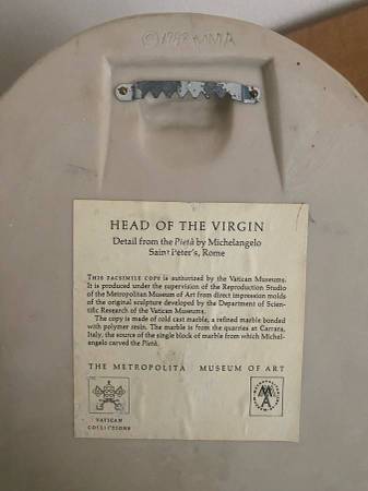 This exquisite wall sculpture is an authorized museum reproduction of the Virgin Mary's head from Michelangelo's iconic Pietà, one of the world's most revered works of art.