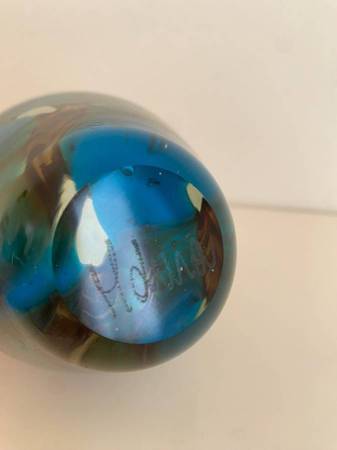 A stunning example of mid-century Maltese glass artistry, this signed Mdina vase showcases the coveted Tiger Blue pattern in a hand-blown form that radiates movement and depth. Rich swirls of cobalt, sand, and seafoam dance across the surface, highlighted by embedded air bubbles and a glossy finish that catches light from every angle.