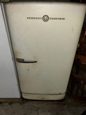 Antique/vintage GE refrigerator. Has been in basement storage for almost 40 years. Plugged it in and it did still work! Temped down to 37 degrees, o did not temp the freezer. It is pretty dirty, but could be a good restore project. It is missing one shelf I believe. Any questions, or more pics let me know. Can be delivered for a fee and prepayment.