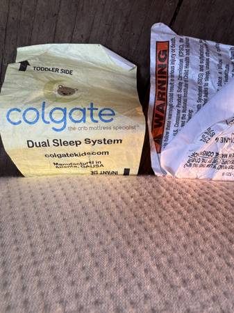 Includes 2-sided (infant and toddler) foam mattress from Colgate, as well as starter set of clean bedding. Pillow not included.