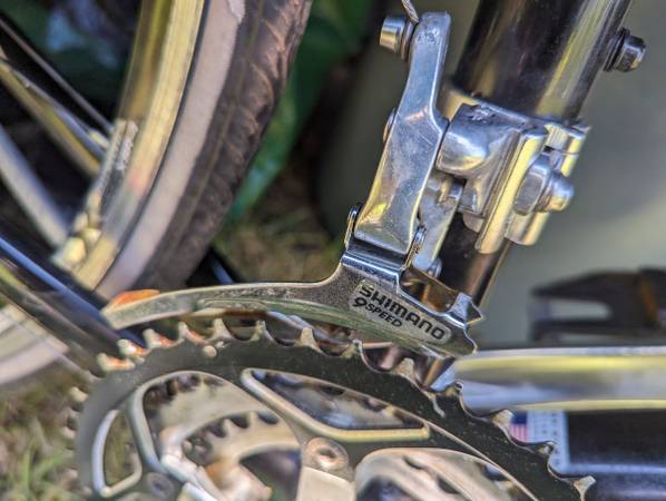 Has a Shimano 105 rear derailleur. 9 speed SRAM cassette. Alloy frame. Relatively lightweight.