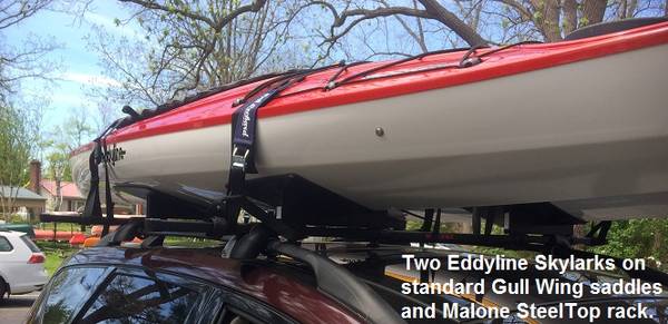 NEW GULL WING Kayak Saddles (Retail $179.) Made of tough ABS plastic. With 'Universal Mighty Mount' fits Yakima and Thule racks & most factory installed racks (remove & install in minutes)....