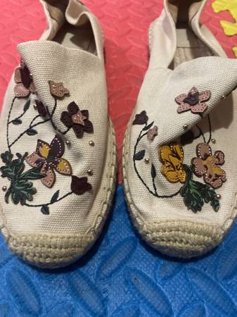 A classic espadrille made of canvas, with colorful leather appliqués, metal studs and beads, it has a jute sole and hand-stitching. An ideal shoe for summer.Canvas upperLeather and jute footbedRubber soleSlip.