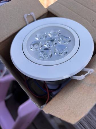 2 brand new LED recessed/can lights in packaging. These are 120v, 7w 2-wire with an adjustable beam angle. 3"-3-1/2" hole, cover is about 4". I don't know the lumens unfortunately... $5/each