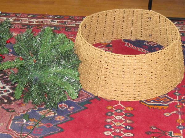 The round base is about 22 inches in diameter and that is the width of the assembled tree at it widest (as tapers to a narrower point at the top).