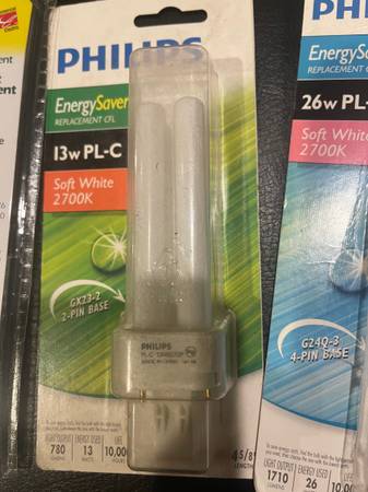 Fluorescent 4pin CFL or PLC Soft white bulb 13watt or 26 watt Or JDE11 100w $3each They are available as long as you see this ad. CL Emails often go to the Spam Box!