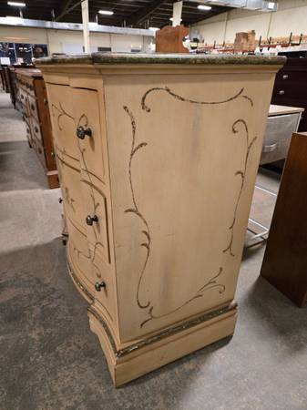 This dresser is in great condition. The French provincial inspired design on this charming little dresser includes molded edges, a gently curved front and of course the gorgeous painted finish. The green vines and pink, blue and yellow flowers are set on a yellow-cream background for maximum visual warmth. Decorative knobs with their own floral pattern provide a nice accent. Stop by and take a look!