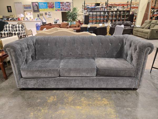 This sofa is in great condition. Sturdily built by KFI, this sofa takes the classic Chesterfield design, complete with high rolled arms and deep tufted cushioning, and wraps it with a luxurious gray velvet fabric. The upholstery is finished with bright nickel studs for a low-contrast accent. Come in and check it out!