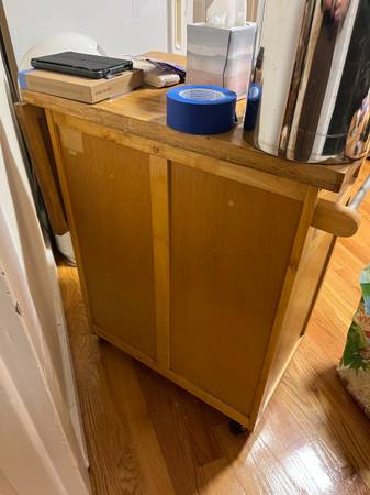 This little cart is super useful for additional storage/counter space. I've had it for years and refinished the top a few years back. This particular model has a towel bar and butcher block fold out. The extension sags/isn't level, but I just put some cardboard between the bar and block and it keeps it steady.