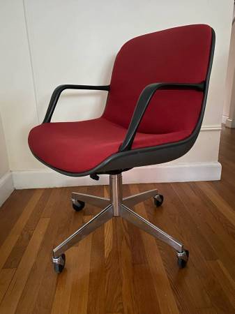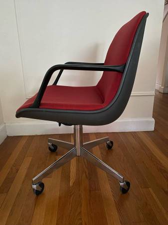Step into the timeless world of mid-century design with this stunning Steelcase Model #451 office armchair, a 1970s classic inspired by the legendary Charles Pollock. With its sculptural silhouette, rich crimson red upholstery, and gleaming chrome base, this chair is more than seating - it’s a statement.