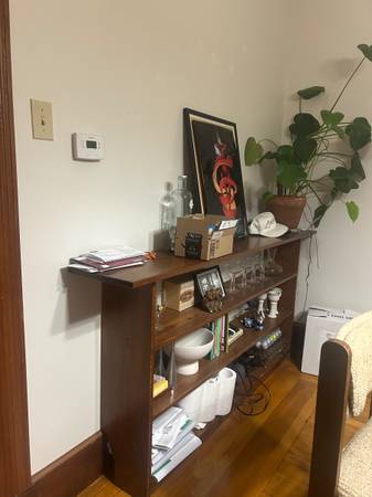 Long wide shelving / bookcase got it at an estate sale but I am redecorating Measurements: - top shelf is 6 feet wide - bottom shelves are 5 ft wide - height of bookcase is 3 ft tall