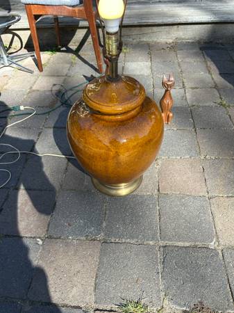 Large Vintage ginger jar lamp with a sort of crackle glaze. I have no shade. Piece is not marked but has a Paul Hanson look to it. Piece is in fair condition. Ceramic portion has a few slight scuffs to the glaze but otherwise excellent. The metal portions are pretty tarnished and it would probably be easier to replace them. Lamp works a shown. Lamp needs some work but a nice mid century look.