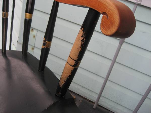 This is a sturdy Harvard University Insignia Classic University College Arm Chair, made of solid hard wood by Nichols and Stone Co., Gardner, Massachusetts. Black color and brown arms. The chair is used and there are normal wear and some scratches on the chair. The chair is very strong and solid. The chair measures approximately: