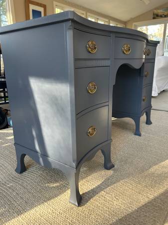 Approx. 100-year-old serpentine desk, fully restored and finished in Benjamin Moore Hale Navy. This piece features tiger oak drawers, dovetail joinery, and original brass hardware, all carefully cleaned and preserved.