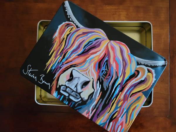2 metal boxes, previously containing Scottish shortbread Lid with reproduction painting by Steven Brown, Highland cow artist $10 each 8 x 10.5 x 2"