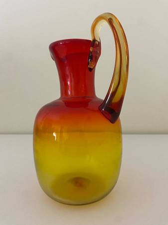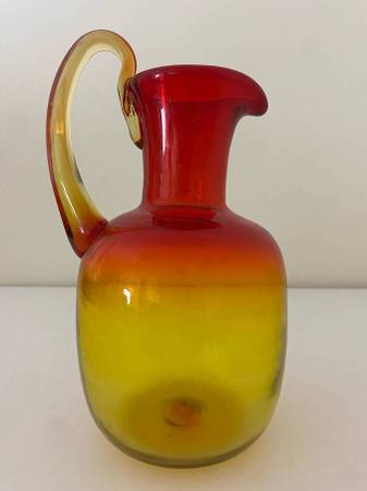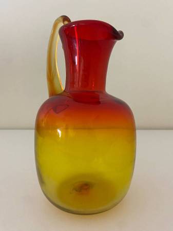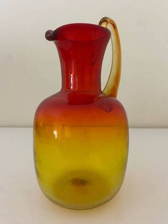 Add a burst of mid-century brilliance to your collection with this stunning Vintage BLENKO Amberina Tangerine Pitcher, a hand-blown masterpiece that glows with fiery elegance. Crafted in the iconic Amberina gradient, this pitcher transitions from deep cherry red at the rim to golden tangerine at the base, showcasing the vibrant artistry that made Blenko a household name in American glass design.