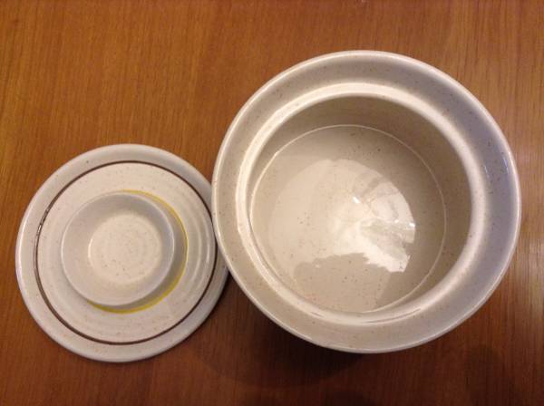 Very tiny minor chip on one side of sugar bowl (see photo) hardly noticeable and not seen when covered. Otherwise in excellent condition.