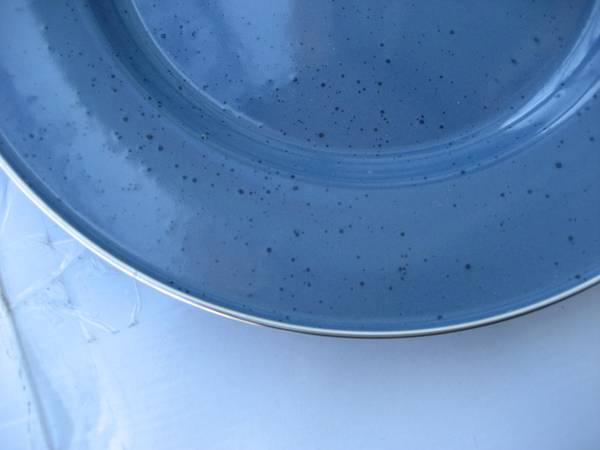 This is Bee and Willow Home Milbrook 12.25" Blue Speckle Enamel Steel Plate with Stainless Steel Rim. The plate is steel, blue and black speckle enamel finish, and with stainless steel rim. The plate measures approximately 12.25" in diameter. The plate is new.