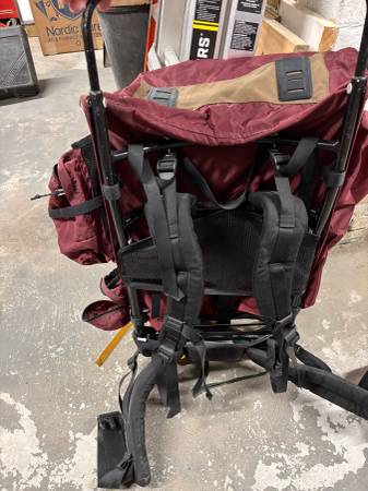 External frame backpacking backpack. 1997 but still has a lot of trips left. Lightweight, handles plenty of gear. Includes rain cover.