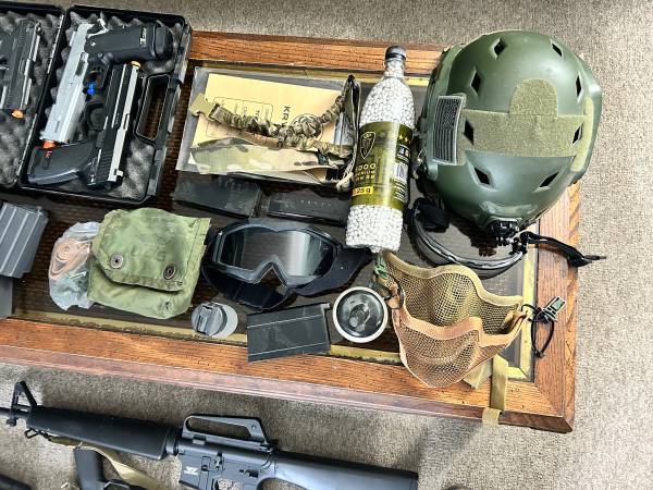 Large Airsoft collection: Krytac Trident SPR MKii JG M-16 Unknown broken M14 Unknown Spring Sniper w/ scope WE-Tech Caspian 1911 (gas) HK USP 45 (gas) Walther P22 (spring) Many accessories including...