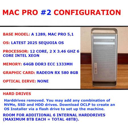 You will need is to install your own harddrive/s (choices include multiple units of NVMe, SSD or HDD hard drives), then download OCLP app and follow easy instructions for creating a USB flash installer drive to complete the OS install and set up the machine.