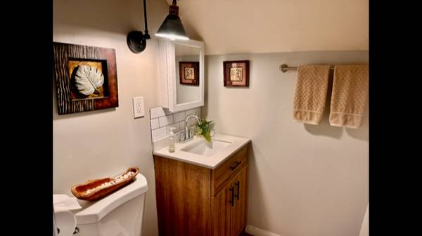 BATH has tub/shower with NEW SINK AND VANITY. Turnkey unit. FLEXIBLE rental agreement. Furnished and decorated to feel like “Home”, Queen bed, cozy loveseat couch in Lvg Rm, Eat-in Kitchen with full-size appliances.