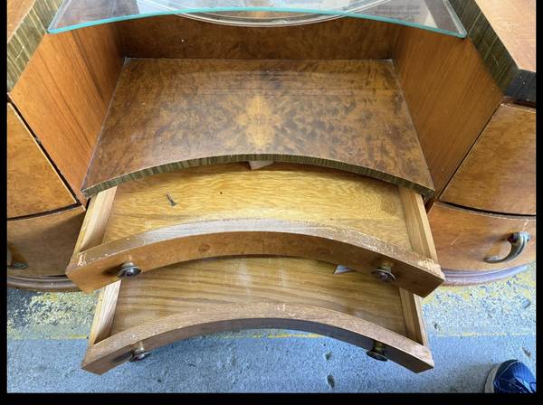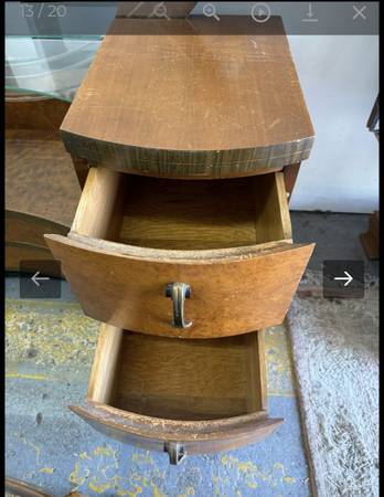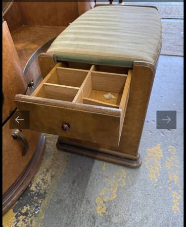 MCM Vanity 6 draw curved front 48 inch mirror with bakelight clips all draws dovetail construction with brass pulls with bakelight all good working condition book matching vernier 8 wooden wheels one is broken but still easy moving matching bench with draw that has devider and matching bakelight pull bench needs reglue and reupholster small lifting of vernier on right top of vanity good overall condition for age see photos